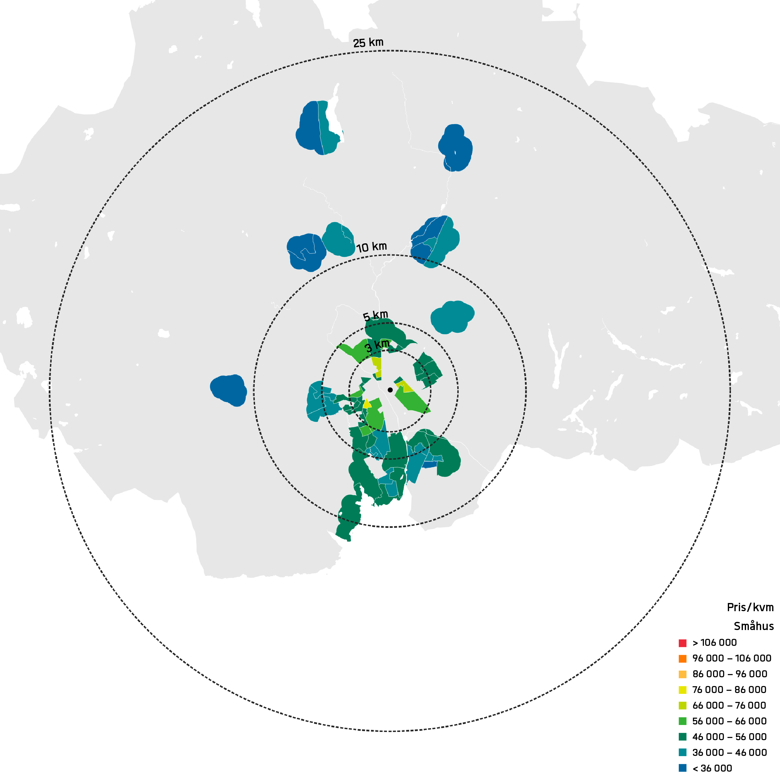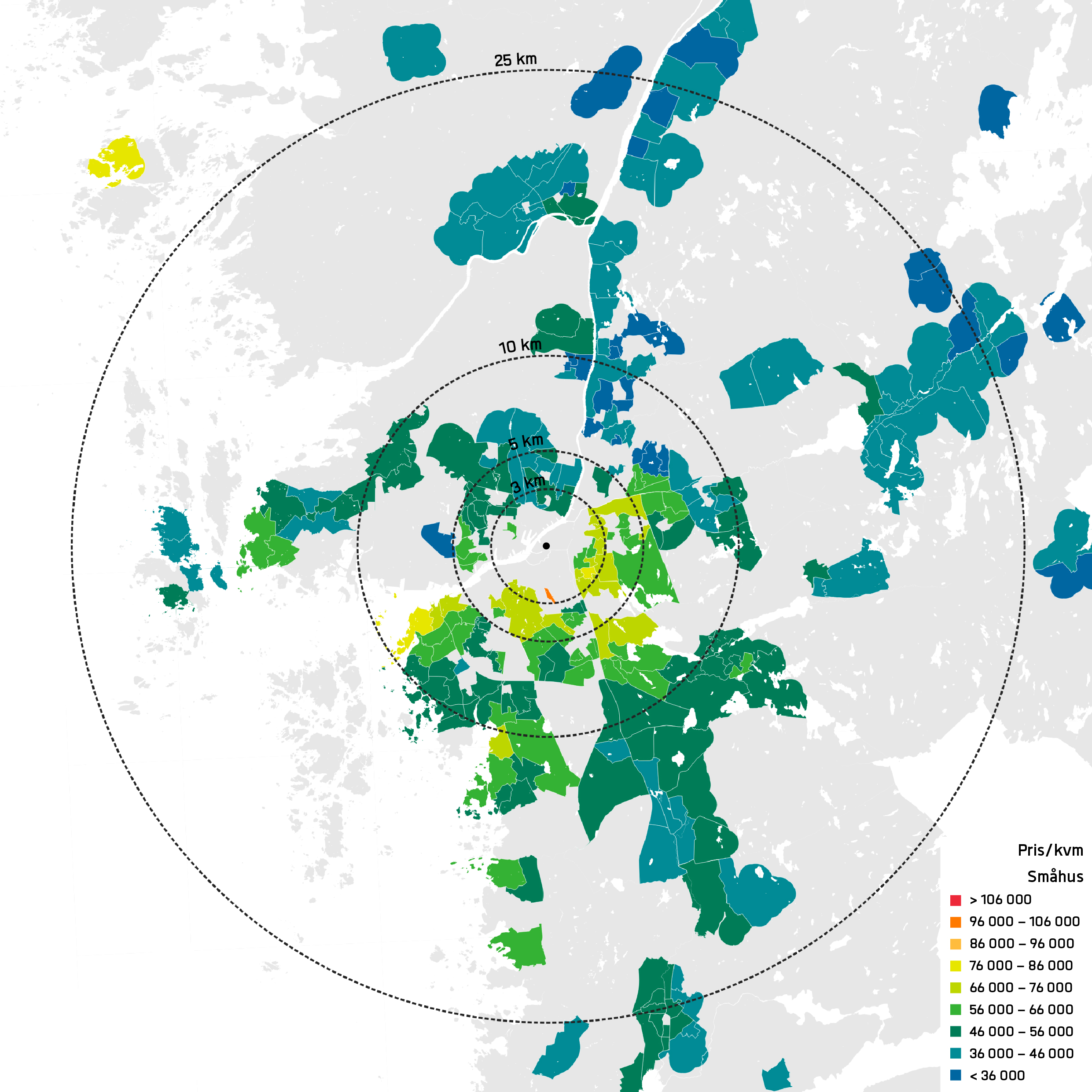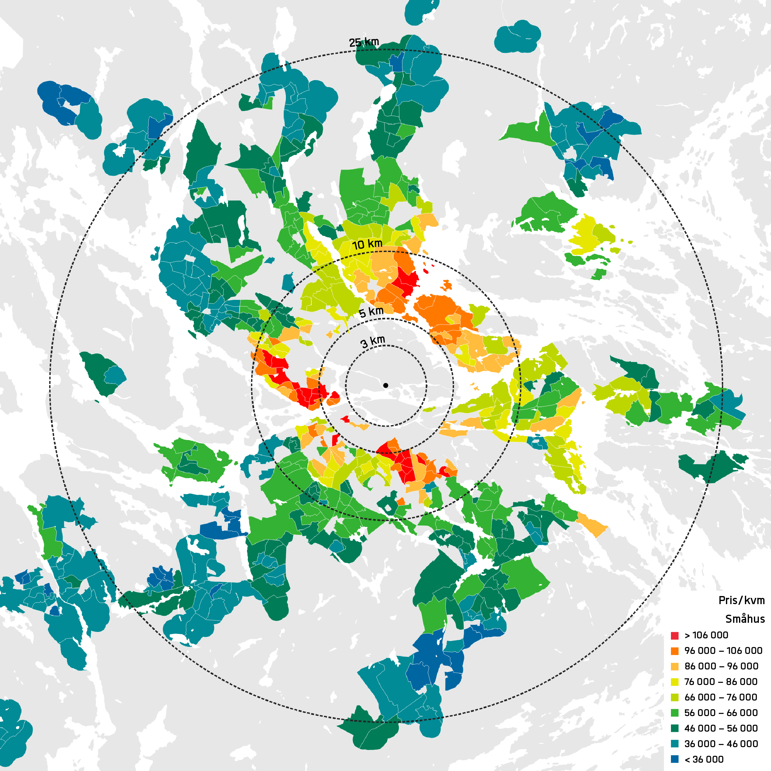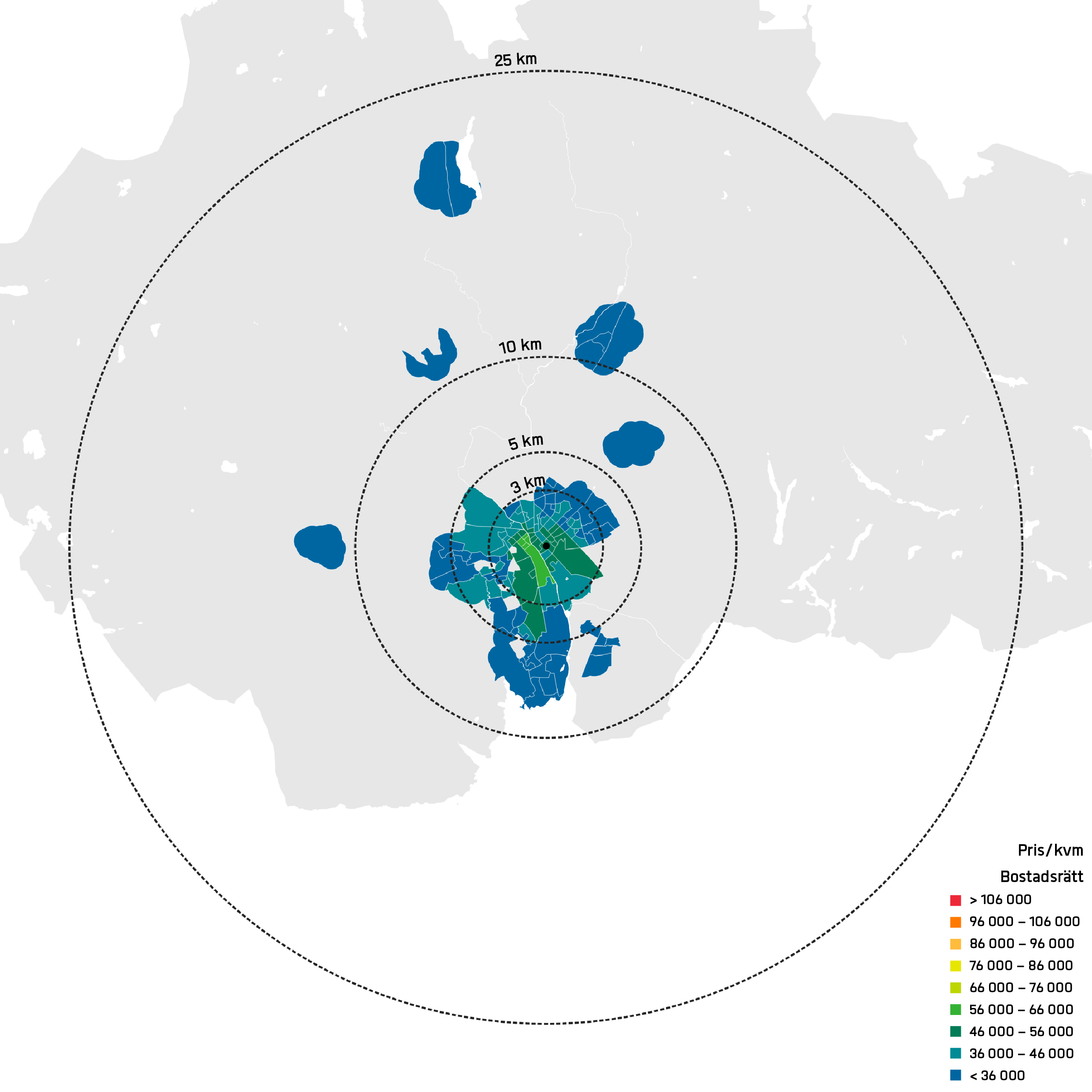 I alla kartor är det tydligt att centralitet korrelerar starkt med pris. I Stockholm är denna effekt relativt jämnt koncentriskt utspridd medan vi kan se att i Göteborg finns de dyraste områdena i centrum och utåt mot sydväst. I Stockholm får man betala ungefär 100 000 kr/kvm för en bostadsrätt i innerstaden. Prisbilden för de dyraste innerstadsområdena i Göteborg ligger kring 80 000 kr/kvm. I Stockholm är innerstaden relativt väl täckt med avståndet 3 km från Centralen. I Göteborg är innerstaden mindre och på 3 km fågelvägen från Centralen kommer man exempelvis förbi Brunnsbo på Hisingen. I centrala Uppsala kostar de dyraste bostadsrätterna kring 60 000 kr/kvm, vilket är lägre en snittet för bostadsrätter i hela Stockholmsregionen.
