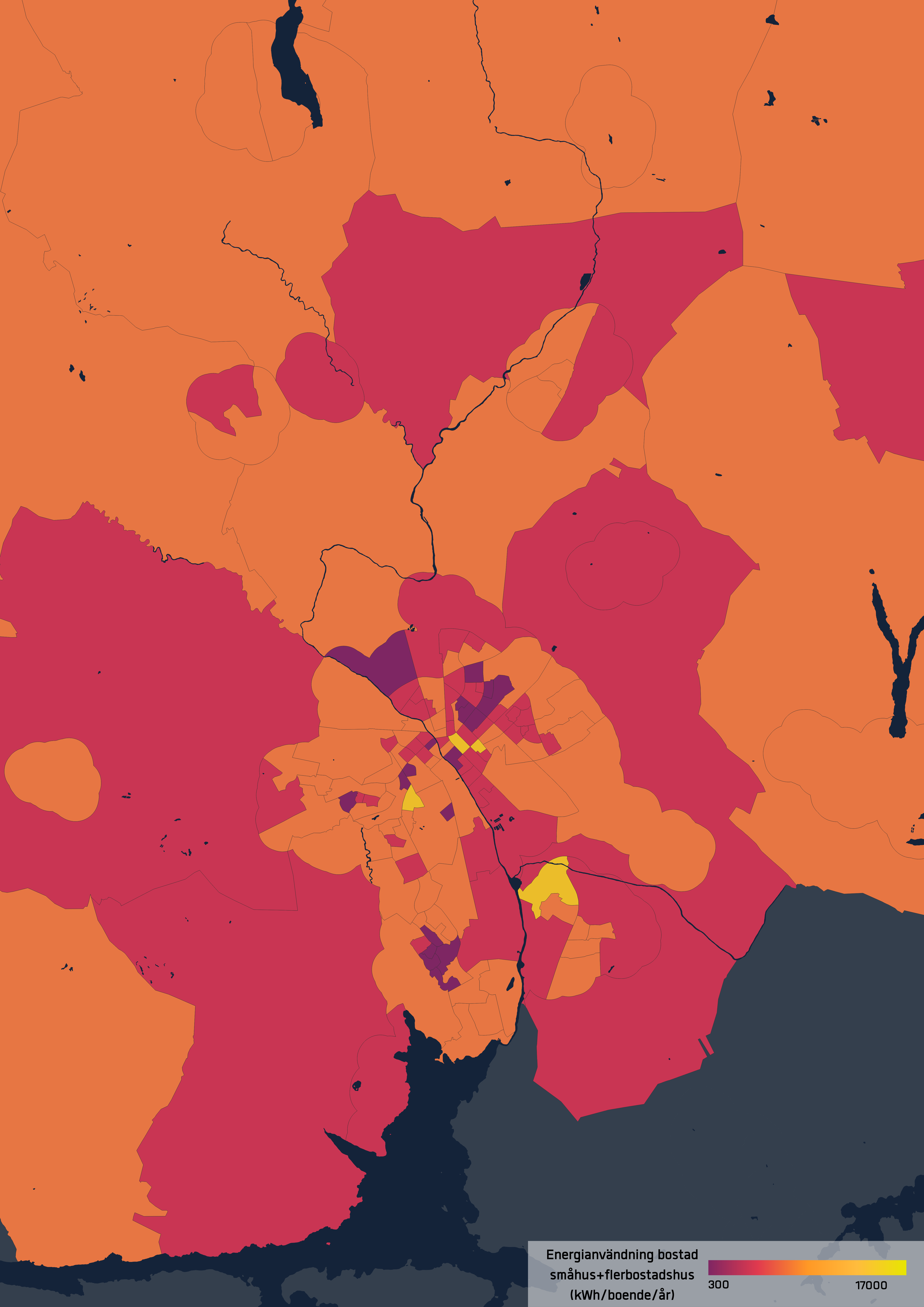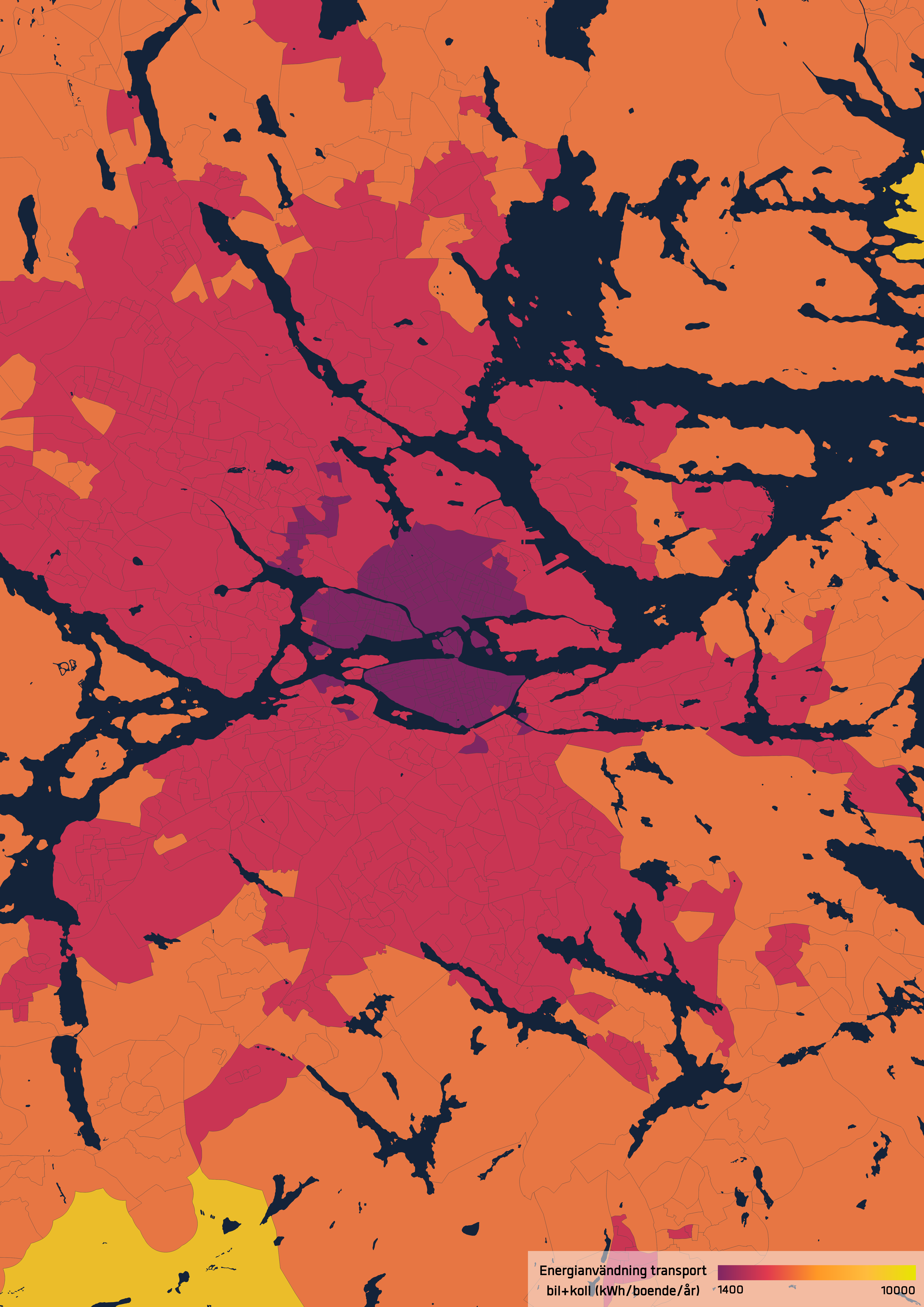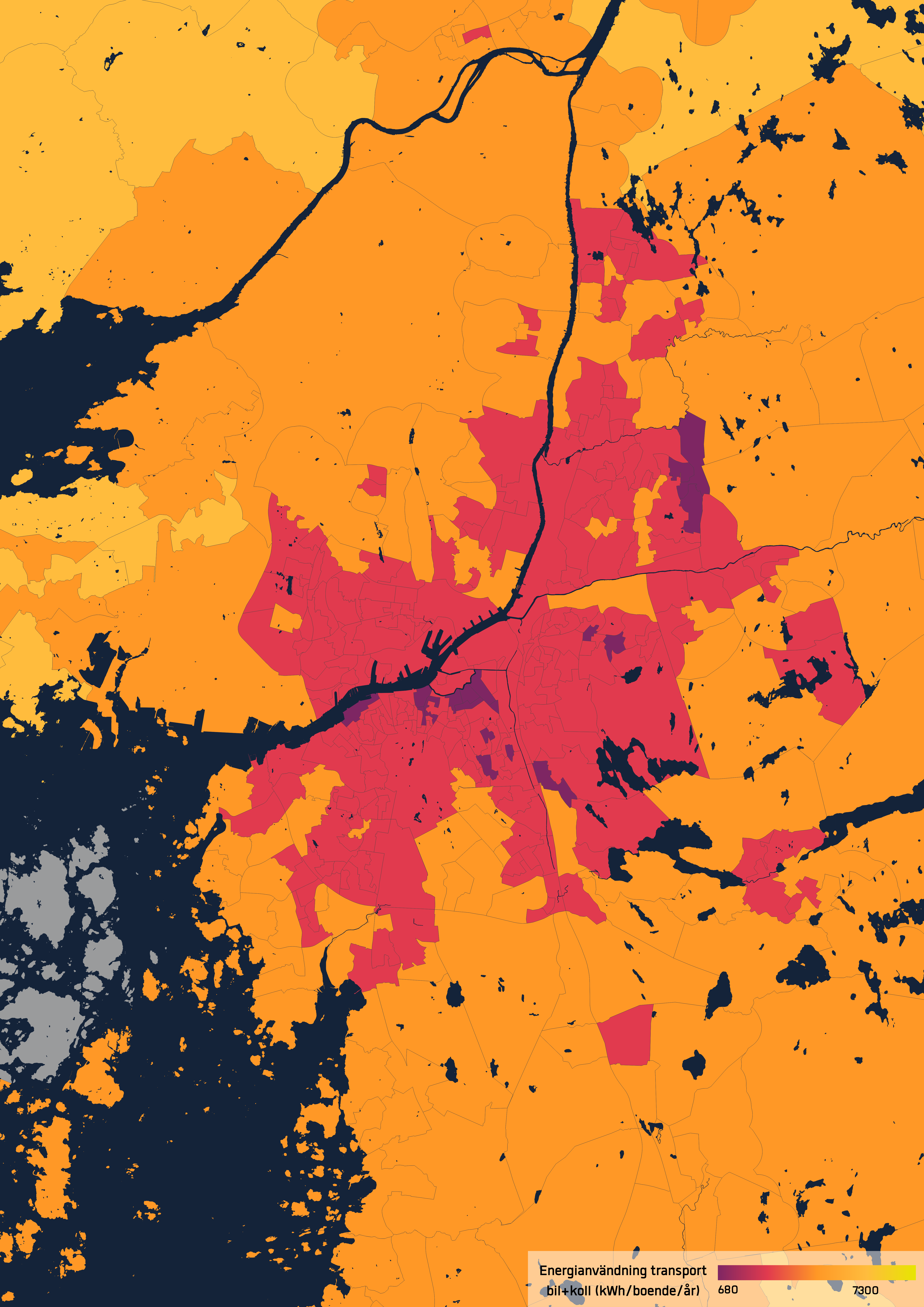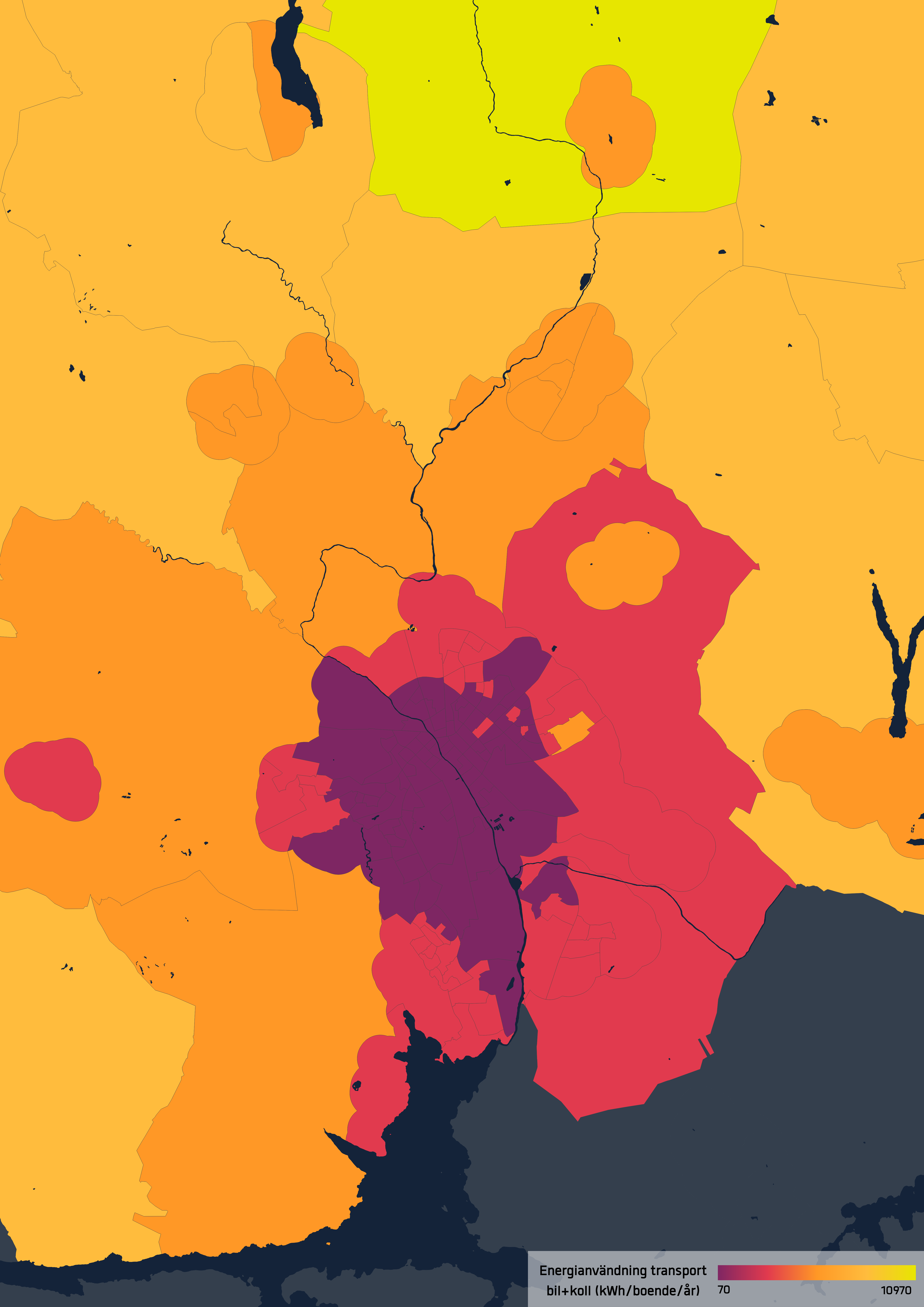 Den sammanslagna energianvändningen för bostadsbebyggelsen (småhus och flerbostadshus) och persontransporterna (bil och kollektivtrafik) har beräknats och visualiserats på stadsdelsnivå, demografiska statistikområden (DeSO), en geografisk enhet framtagen av SCB.