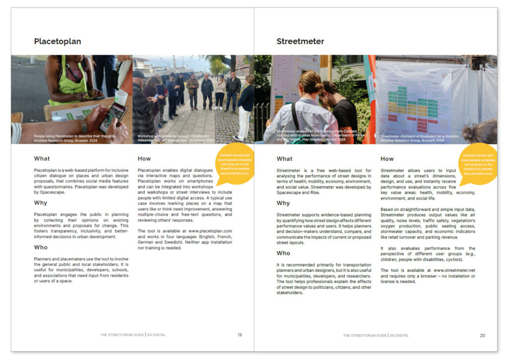 StreetForum, which runs from 2023 to 2025, is a European partnership between research institutions, cities, and design agencies in Brussels, Vienna, Stockholm, and Istanbul. The project develops a toolkit of analogue and digital methods to help cities co-create better streets through dialogue and collaboration. These methods include participatory workshops, digital mapping tools, co-design games, and on-street experiments — all tested in real urban contexts known as living labs. The goal is to make it easier for local actors to navigate the often-conflicted process of street transformation and arrive at solutions that are both effective and widely supported. By focusing on collaboration rather than top-down planning, StreetForum treats the street as a shared space for negotiation — a literal forum for the city.