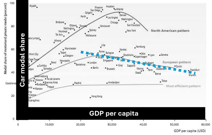 Städer med stark kollektivtrafik har lägre bilberoende och högre tillgänglighet för alla grupper i samhället. Världens mest bilfria städer är de med bäst kollektivtrafik, som t.ex. Zurich, Singapore, Wien, Bern. Över hälften av variationen i bilresande mellan städer kan förklaras av kollektivtrafikandelen. När kollektivtrafiken prioriteras på vägar och gator minskar restider och bilberoendet. Om andelen kollektivtrafikresor ökar med 25 % skulle Göteborg få liknande resemönster och färdmedelsfördelning som nämnda världsstäder, som också rankas som världens bästa städer mätt i livskvalitet (quality of life).