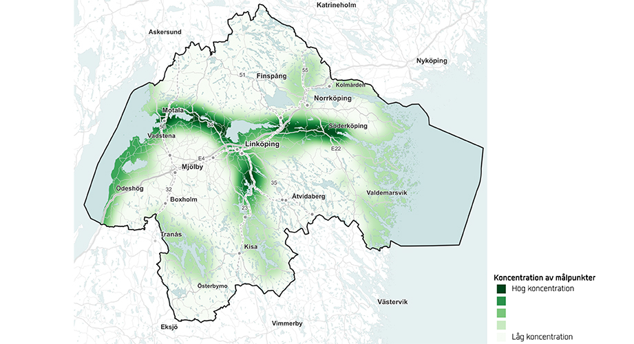 Koncentration av målpunkter i temat Natur, leder och kanaler -