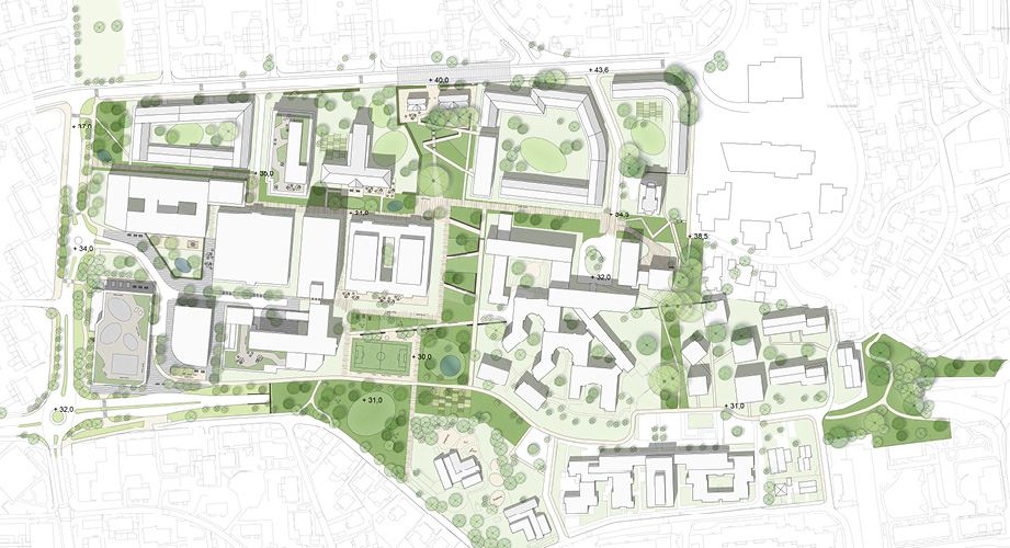 Den slutgiltiga planen har ett stort fokus på återbruk där kvaliteterna i dagens plan har tillvaratagits samtidigt som nödvändiga modifieringar har gjorts för att öppna upp området mot omgivningen och skapa nya, attraktiva rum i den idag slutna sjukhusstrukturen.