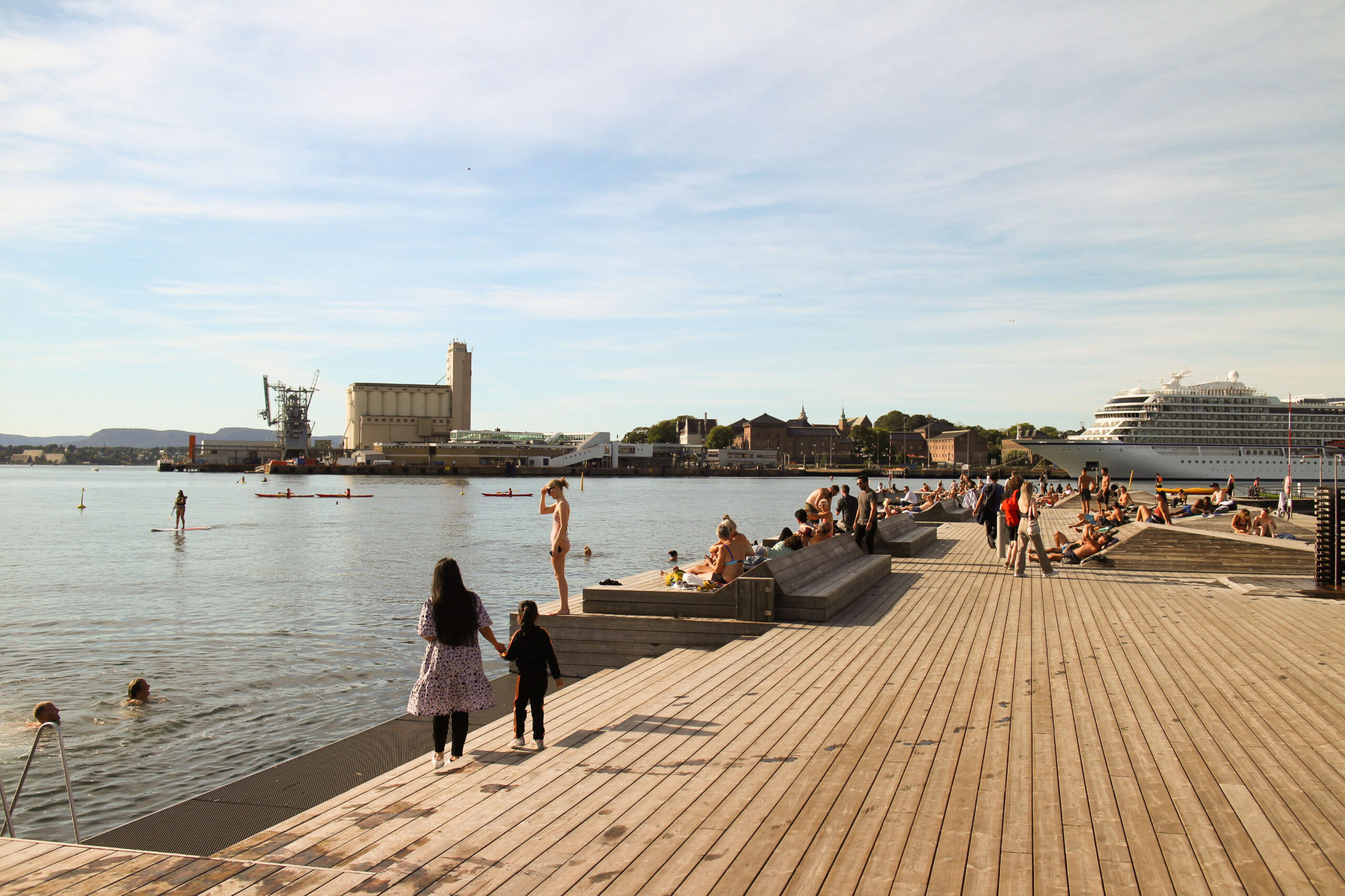 Dag 1 vandrade vi längs Fjordbyen, Barcode, Bjørvika och Bispevika som vi också har analyserat och dagen avslutades med bad på Sørenga havsbad.