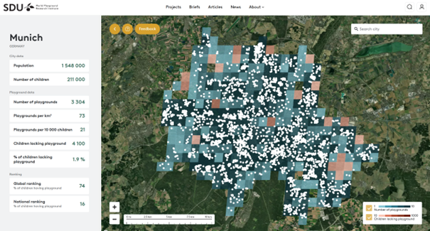 On the start page, visitors are greeted with a world map ranking cities according to the share of children with access to a playground. The ranking can be filtered by region, city size, or specific indicators such as the number of playgrounds per square kilometer or the percentage of children without access. The dataset covers every city in the world with more than 50,000 inhabitants — offering a global overview of children’s outdoor environments. Zooming in on a city reveals detailed statistics: the total population, the number of children, the number of playgrounds, and the share of children without access. The city’s global and national ranking is also displayed, providing a quick sense of scale and comparison. Going further, users can view playgrounds as dots on the map, overlaid with a 1×1 km grid that highlights how access varies across different parts of the city. By clicking on a grid cell, one can see the number of playgrounds and children with or without access within that specific area.